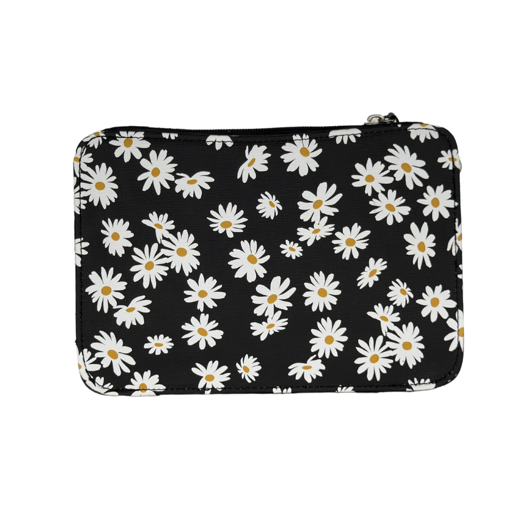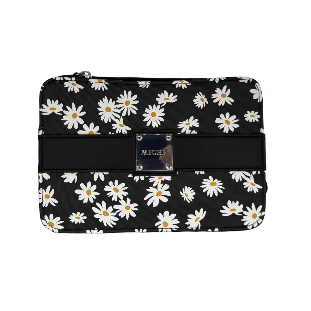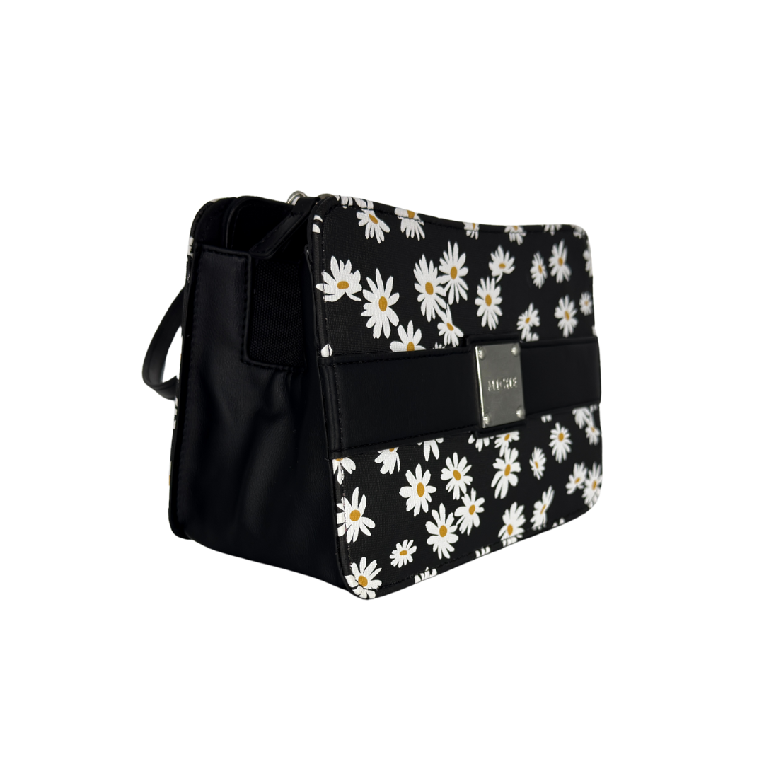 The Chrys design showcases delicate white daisies on a classic black background, accented with shiny silver hardware and black trim. For a crossbody style, pair it with a Long Petite Handle for effortless, hands-free carry.